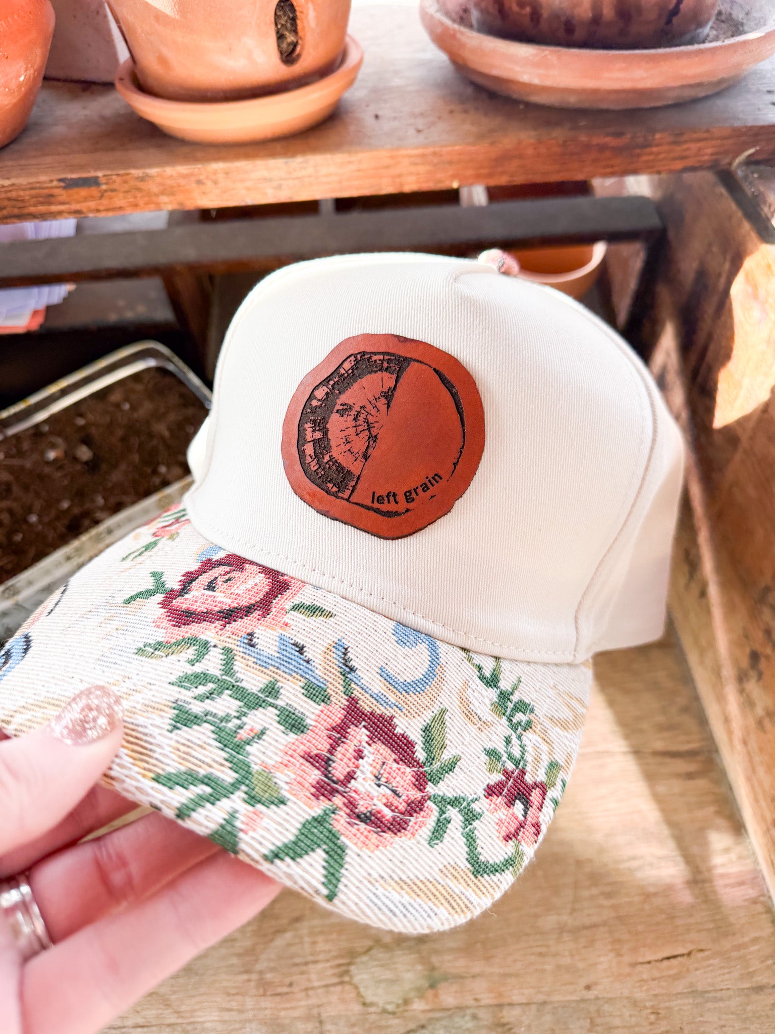 Custom Logo Hat on Cream Hat with Floral Bill