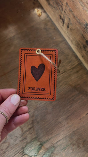 Wooden or leather stamp ornament with heart engraved onto it.